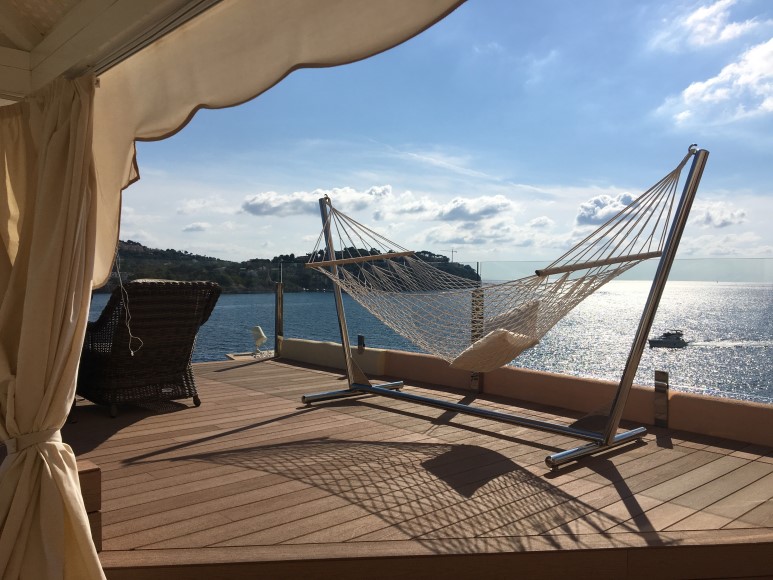 테라스 입구에는 작은 테이블, 긴 의자와 수영복 건조대가 있었고
