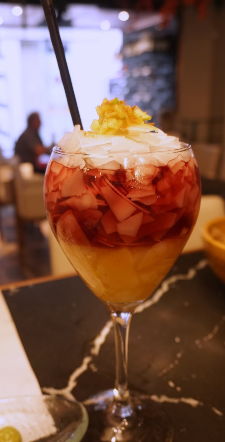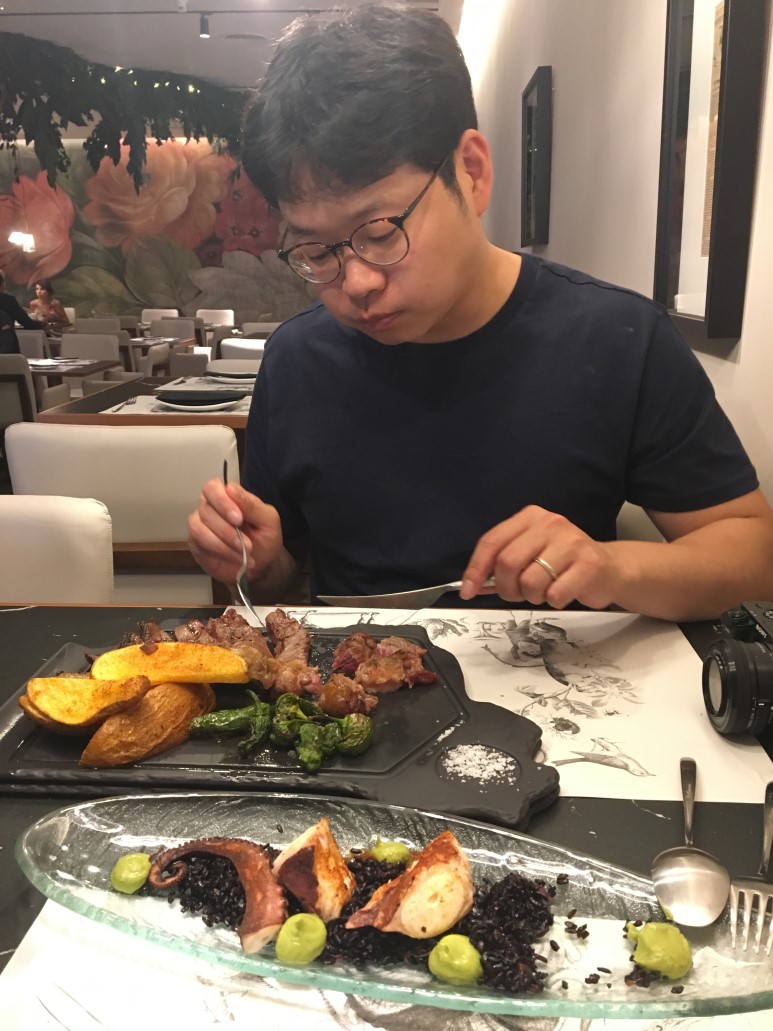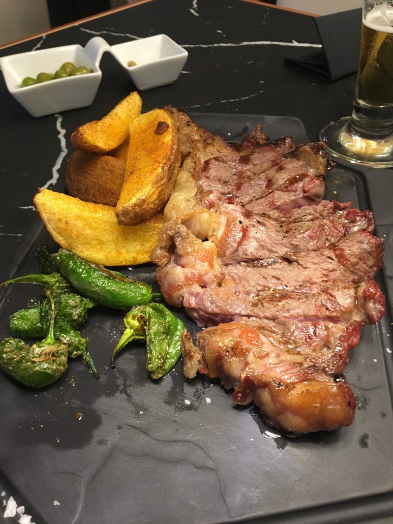 스페인에서 꼭 먹어봐야한다는 문어요리와 스테이크, 맥주와 샹그리아를 주문했어요.
