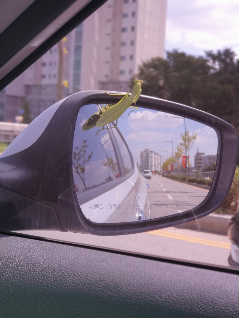처음으로 돌아가 우리 차에 붙어있는 사마귀를 생각해 봅니다. 그 사마귀는 아마도 수컷이었을 가능성이 큽니다. 암컷과 짝짓기를 한 후, 탈출한 것입니다. 아주 멀리 알아낼 수 없는 곳으로 가기 위해 우리 차에 무임으로 탄것입니다. 그리고 도망가는 자신의 모습을 거울로 보며 여러가지 감성에 휩싸였을 것입니다.
