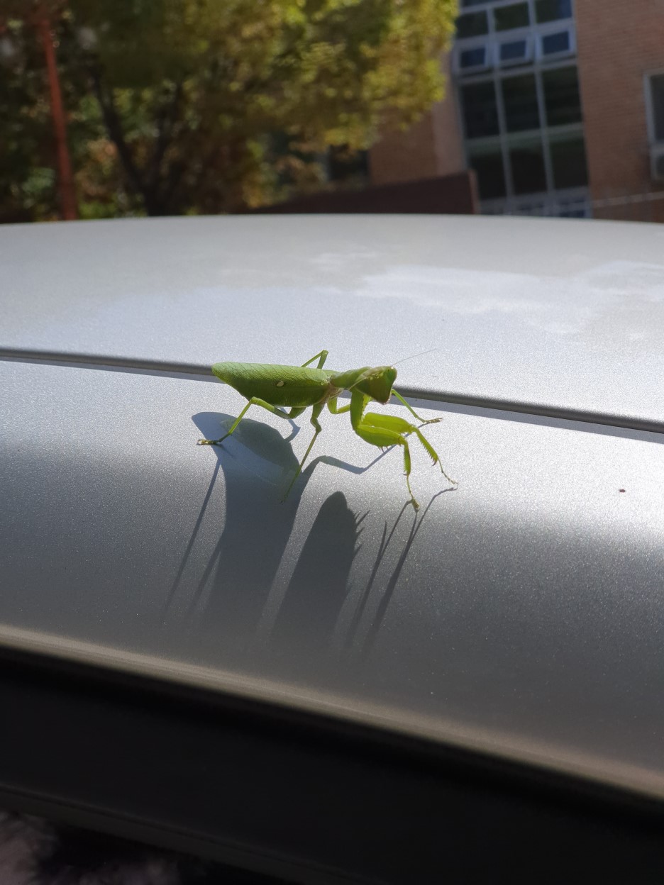 사마귀가 차에 붙어 있었습니다. 어디서 갑자기 나타난건지 늠름하기까지 합니다. 같이 있던 용기있는 동료 쌤이 근접촬영에 성공한 사진입니다. 저렇게 가느다란 다리로 어떻게 붙어있었을까 신기하기만 합니다.