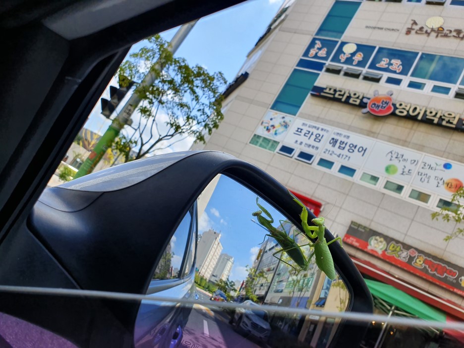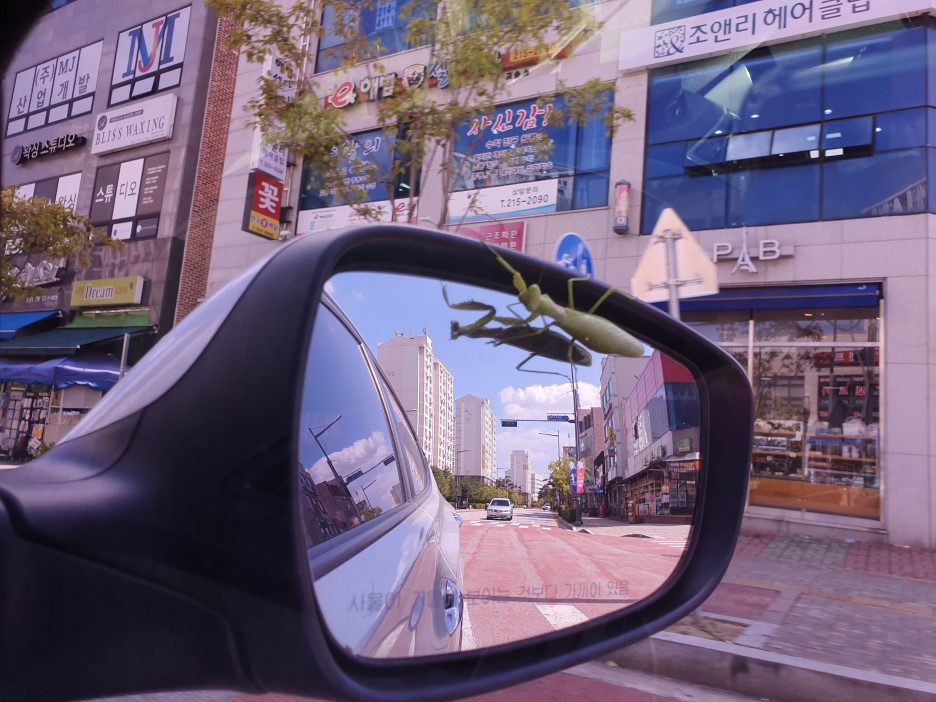 오늘 점심시간, 평소 좋아하는 선생님들과 함께 맛있는 점심을 먹고 차에 탔는데 사이드 미러에 사마귀가 앉아 있었습니다. 우리는 놀랐지만, 침착하게 차에 탑승했습니다. 차가 출발하면 금방 떨어져 나갈 것같았습니다. 그렇게 생각하니 불쌍하기도 하고 그랬습니다.