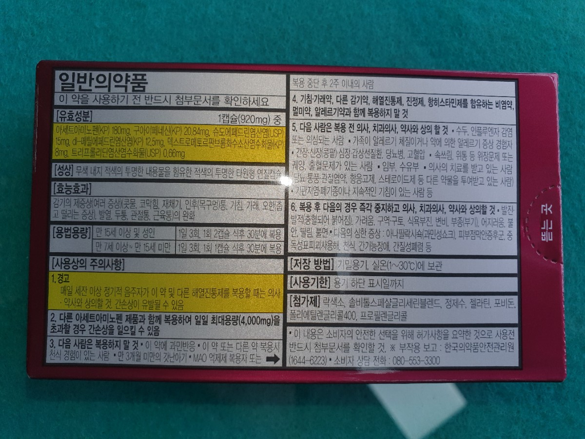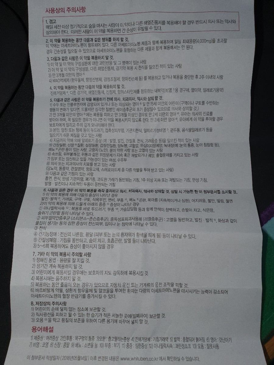 매일 세잔 이상 정기적으로 술을 마시는 사람이 이 약이나 다른 해열진통제를 복용해야 할 경우 반드시 의사 또는 약사와 상의해야 한다, 이러한 사람이 이 약을 복용하면 간 손상이 유발될 수 있다. 이외의 내용은 위 사진을 참고해주시기 바랍니다.