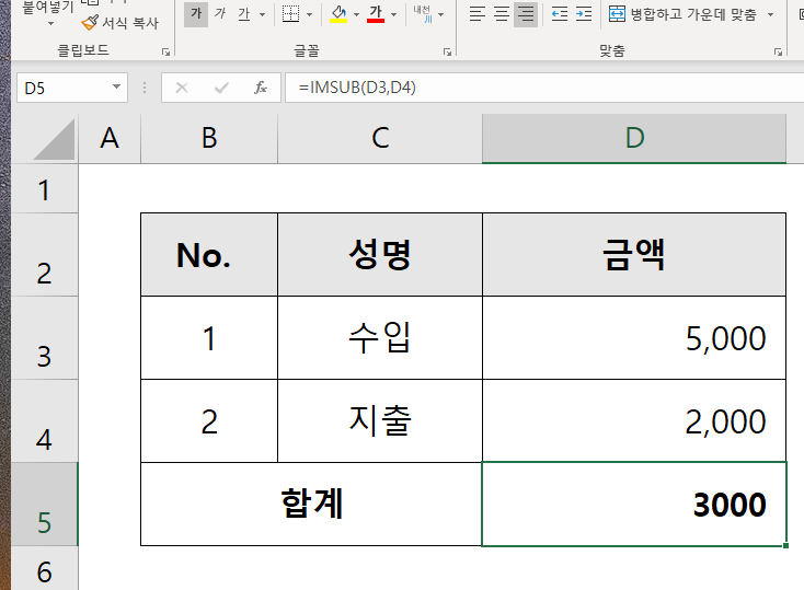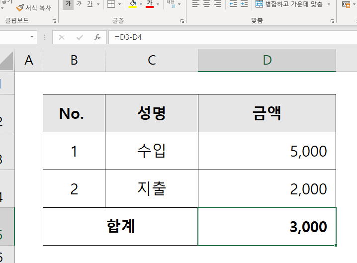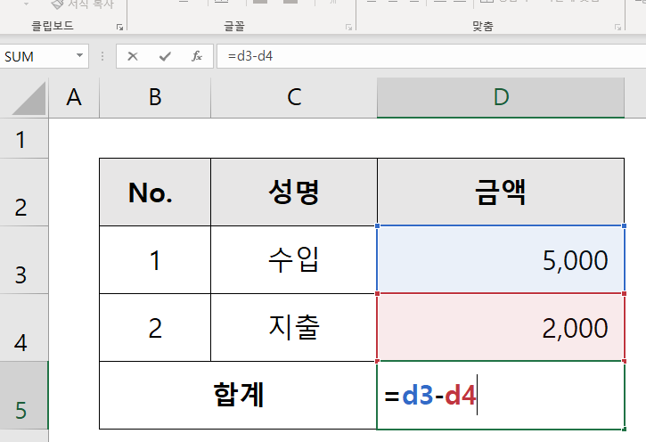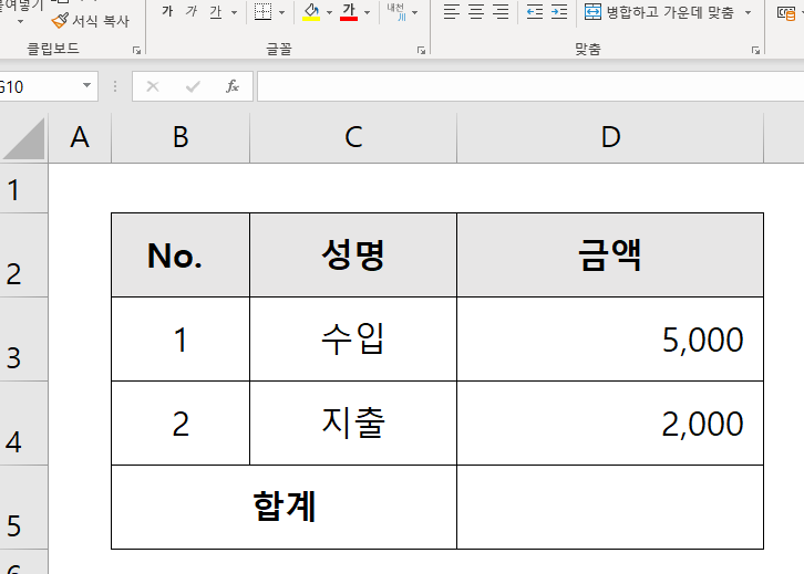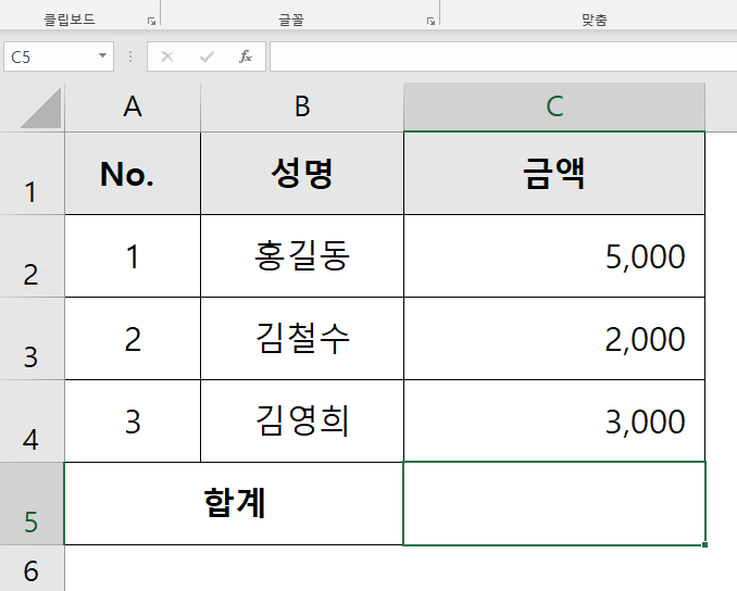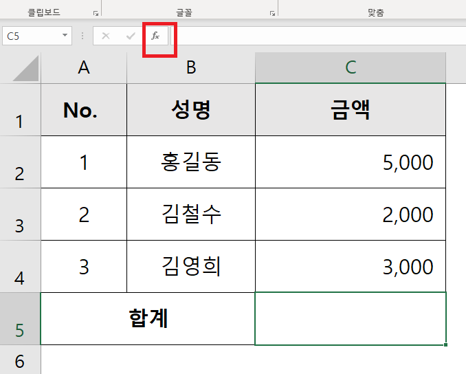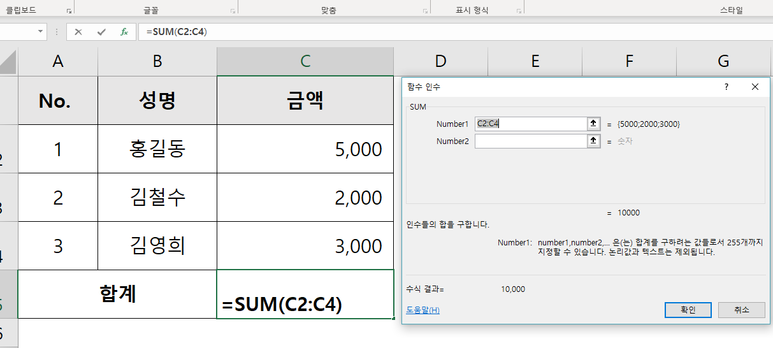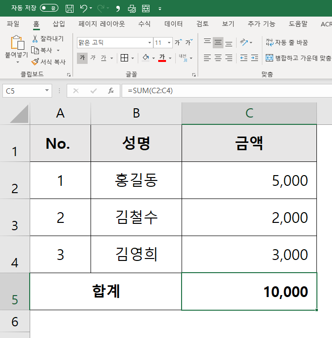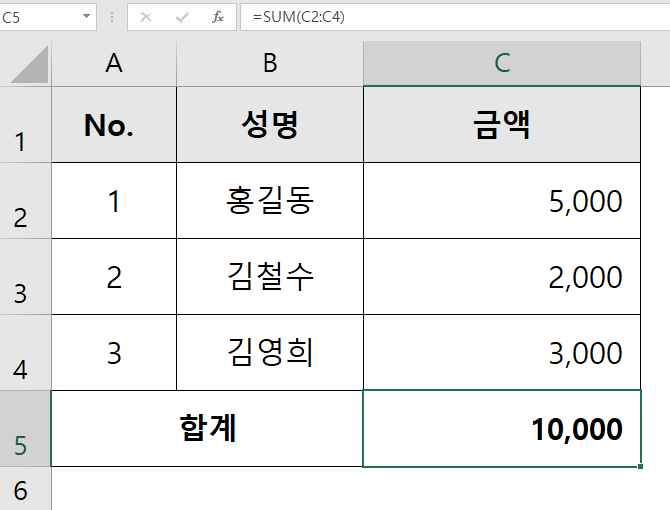 정상적으로 10,000이 나왔네요. c5셀의 합계란 칸에 표시 되는건 10,000이라 할지라도 칸을 클릭하면 위 함수 표시줄에 10,000이 아닌 =sum(c2:c4) 로 나오는 것을 알수 있는데요. 이는 c2부터 c4까지 값을 합을 하라는 함수값이 나타난 것입니다.