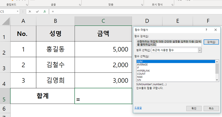 3. 함수 마법사 화면이 실행이 되는데, 함수선택에서 SUM을 선택하고 확인버튼을 클릭합니다.