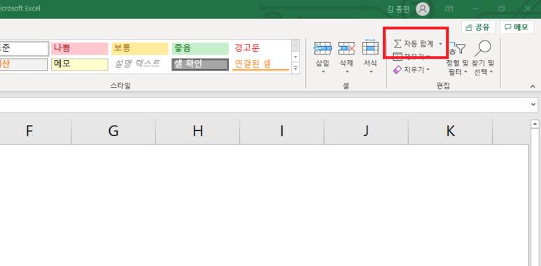 합계창에 이것저것 선택을 안하고 바로 함수값을 직접 입력하는 방법이 있습니다. 처음에는 위의 1번 방법으로 하는것이 편하겠지만, 점차 함수가 익숙해지면 바로 함수값을 입력하는 것이 훨씬 쉽고 빠릅니다. 대부분 함수를 쓸때는 이 방법을 많이 씁니다.